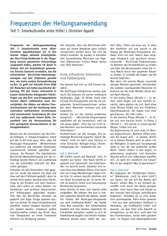 Frequenzen der Heilungsanwendung Teil 7: Interkulturelle erste Hilfe! Christian AppeltNachdem wir in den letzten Folgen aktuelle Einsatzfelder der Bio12Code-Heilkunde in der Umge- bung unseres gewohnten Praxisalltags vorgestellt haben, möchte ich Ihnen in diesem Teil ein brandaktuell geworde- nes Einsatz-Szenario vorstellen, das die entwickelten Bio12Code-Anwendungs- lösungen auf den Prüfstand gestellt hat, wie keine andere Herausforderung vorher: Es geht um schnelle erste Hilfe für Menschen mit hoher psychischer Be- lastung. Mit den immer zahlreicher in unsere Kulturkreise drängenden Flücht- lingen aus den Not- und Kriegsgebieten warten damit vollkommen neue Ein- satzfelder: Der Abbau von akuten Trau- masituationen und die Auslösung eines zumindest rudimentären Urvertrauens sind existenzielle Fundamente für eine sich neu aufbauende innere Ruhe, Ge- sundheit und die Voraussetzung für eine gelingende Kommunikation in der Gastgeberkultur.