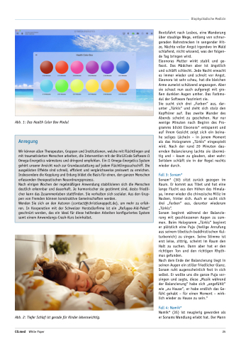 Sie sucht sich drei „Farben“ aus, dar- unter „Türkis“ und zieht sich stolz den Kopfhörer auf. Das zweite Wunder des Abends scheint zu geschehen. Nur nur wenige Minuten nach Beginn des Pro- gramms blickt Eleonora* entspannt und auf ihrem Gesicht zeigt sich ein beina- he seliges Lächeln – in jenem Moment als das Hologramm „Türkis“ eingespielt wird. Nach der rund 20 Minuten dau- ernden Balancierung lachte sie übermü- tig und – kaum zu glauben, aber wahr: Seitdem schläft sie in der Regel nachts wieder durch.
