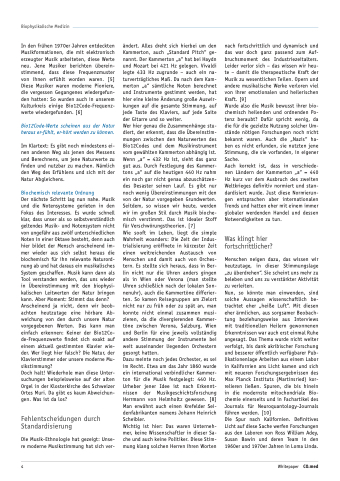 Der nächste Schritt lag nun nahe. Musik und die Notensysteme gerieten in den Fokus des Interesses. Es wurde schnell klar, dass unser als so selbstverständlich geltendes Musik- und Notensystem nicht von ungefähr aus zwölf unterschiedlichen Noten in einer Oktave besteht, denn auch hier bildet der Mensch anscheinend im- mer wieder aus sich selbst heraus die biochemisch für ihn relevante Naturord- nung ab und hat daraus ein musikalisches System geschaffen. Musik kann dann als Tool verstanden werden, das uns wieder in Übereinstimmung mit den biophysi- kalischen Leitwerten der Natur bringen kann. Aber Moment: Stimmt das denn? Anscheinend ja nicht, denn wir beob- achten heutzutage eine hörbare Ab- weichung von den durch unsere Natur vorgegebenen Werten. Das kann man einfach erkennen: Keiner der Bio12Co- de-Frequenzwerte findet sich exakt auf einem aktuell gestimmten Klavier wie- der. Wer liegt hier falsch? Die Natur, der Klavierstimmer oder unsere moderne Mu- sikstimmung?